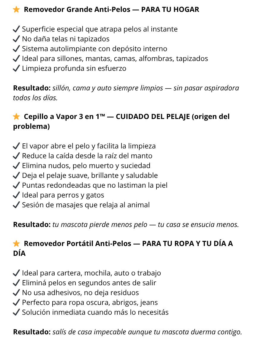 Un cepillo a vapor que reduce la caída del pelo de tu mascota, un removedor portátil para tu ropa y un removedor grande para tu hogar.